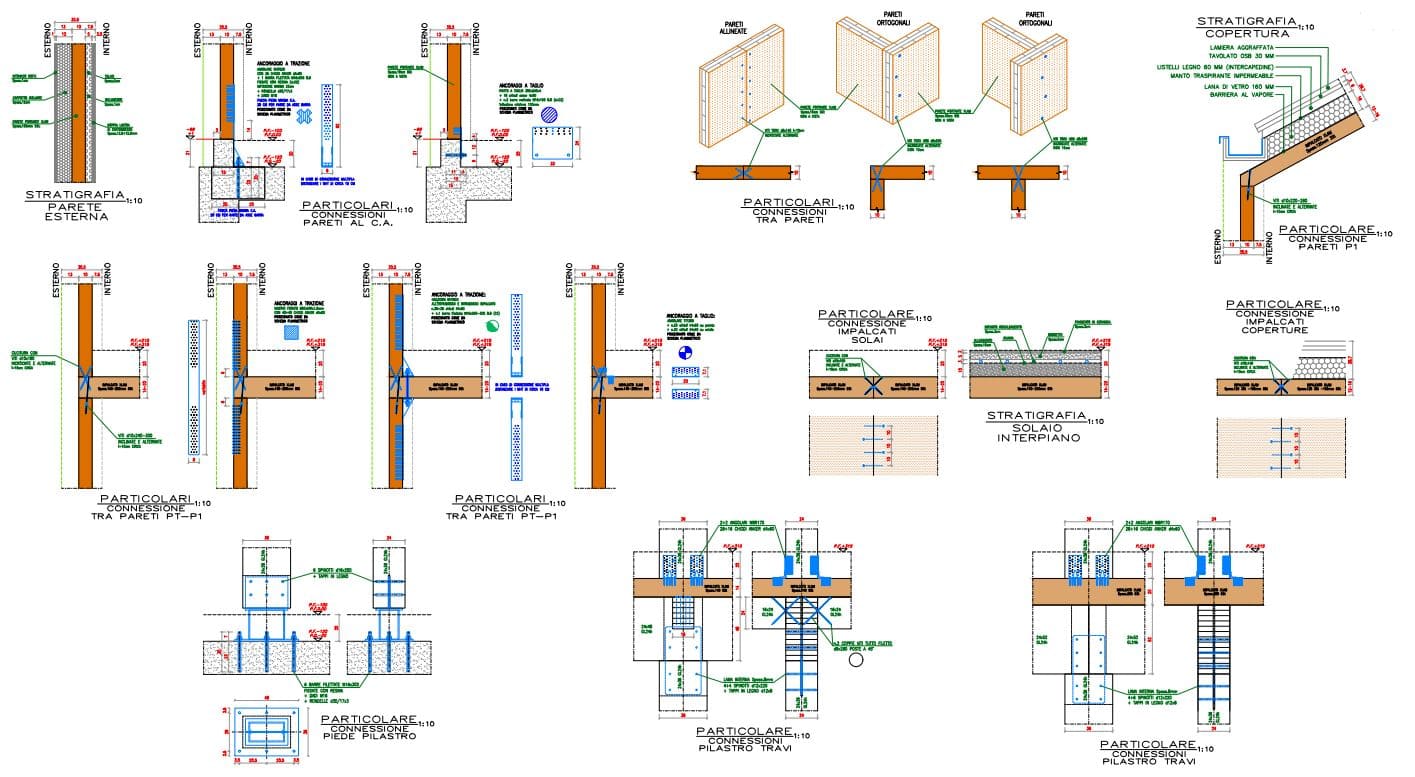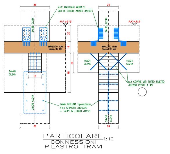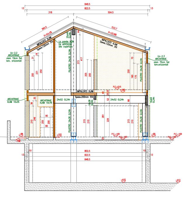 Strutture in legno: Pareti e solai in CLT, Travi in Legno Lamellare Interrato CA: Setti e pilastri in CA, Travi CA e solaio predalles, Pergolato in pilastri e travi in acciaio