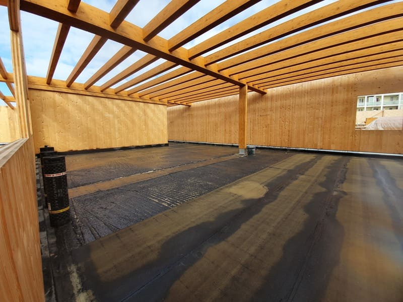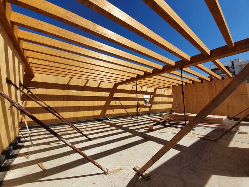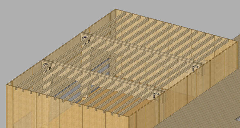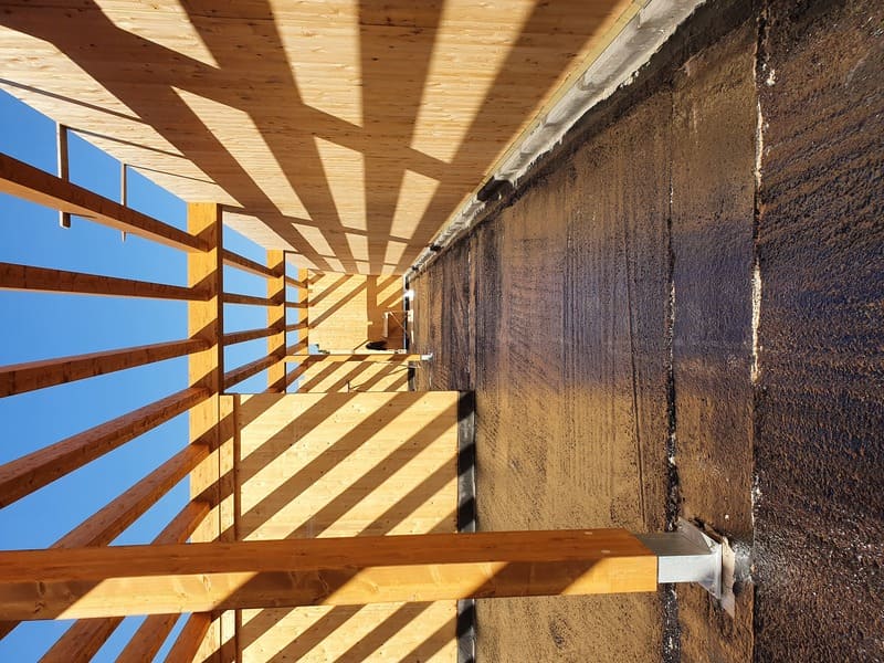 Strutture in legno: Pareti e impalcati in CLT, O.Principale e secondaria in legno lamellare, Impiego di cordolo ventilato alla base delle pareti