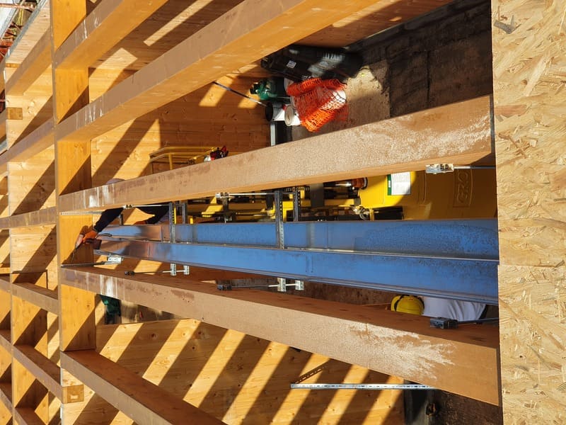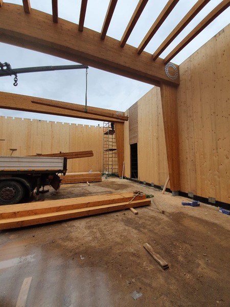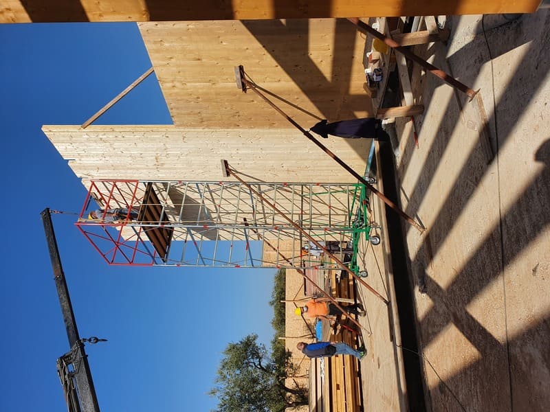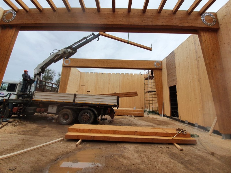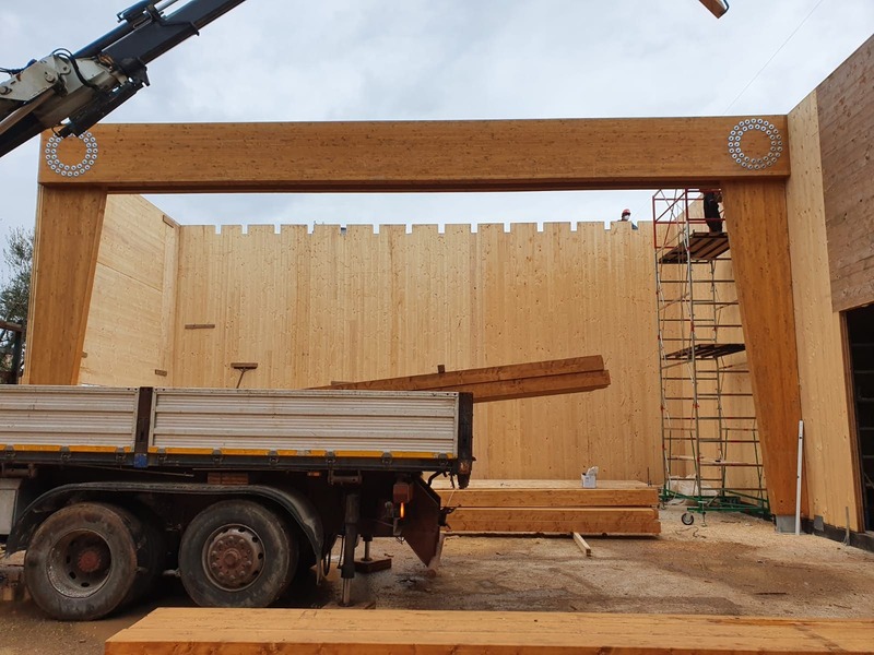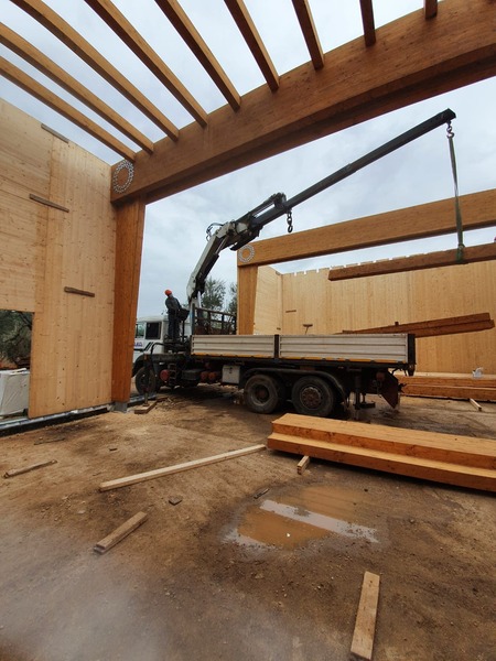 Strutture in legno: 1858 mq (totali in pianta) - Strutture CA: - 1966 mq (totali in pianta) - Mq di pannelli CLT: 1363.50 mq - Mc di pannelli CLT: 141.65 mc - Mc di legno lamellare: 121.78 mc Kg di acciaio: 790 kg