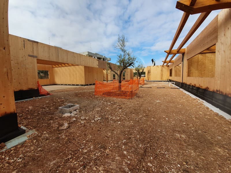 L’intervento in oggetto riguarda la costruzione della nuova scuola del Comune di Bitetto. Il progetto architettonico è dello Studio Settanta7 di Torino, mentre l’impiantistica dello studio Perillo. La progettazione strutturale, della quale ci siamo occupati, riguarda sia l’apparato fondale che la parte in elevazione in legno. La struttura in elevazione è costituita da pannelli X-lam per quanto riguarda le pareti strutturali, mentre la copertura sarà a travi in legno lamellare.